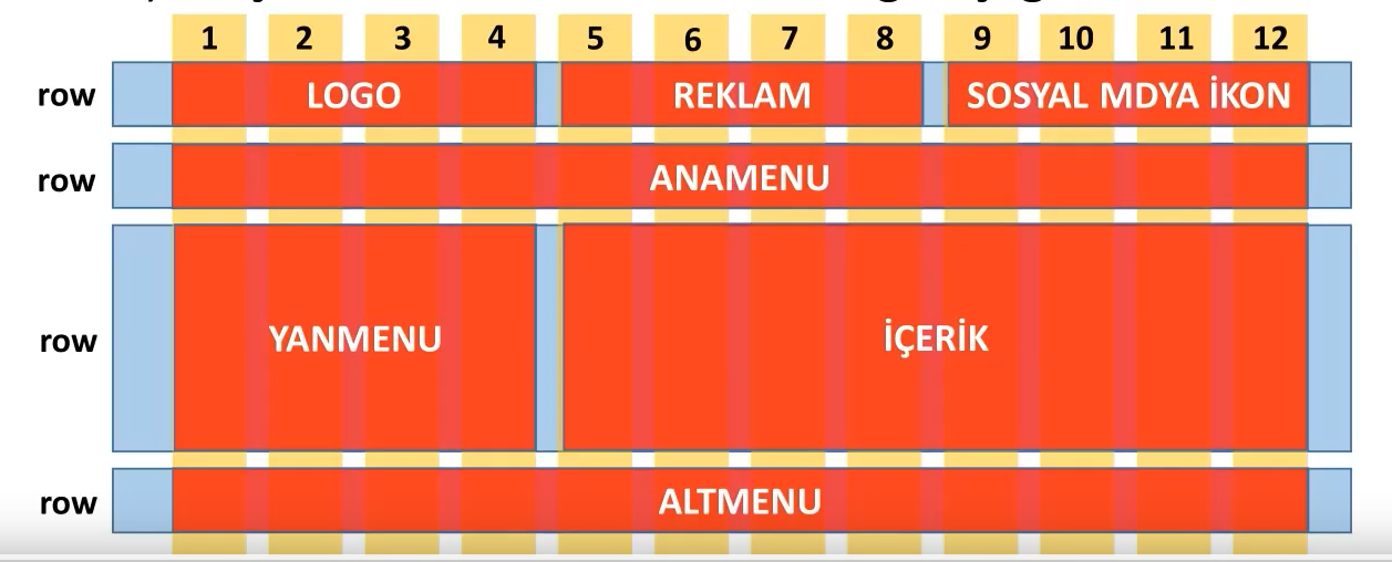 <body><divid="container"><headerid="logo"><!-- Buraya başlık bilgileri gelecek --></header><navid="anamenu"><!-- Buraya ana menü gelecek --></nav><sectionid="icerik"><article><!-- Buraya içerik 1 gelecek --></article><article><!-- Buraya içerik 2 gelecek --></article></section><asideid="yanmenu"><!-- Buraya yan menü gelecek --></aside><footerid="altmenu"><!-- Buraya telif bilgileri gelecek --></footer></div></body>