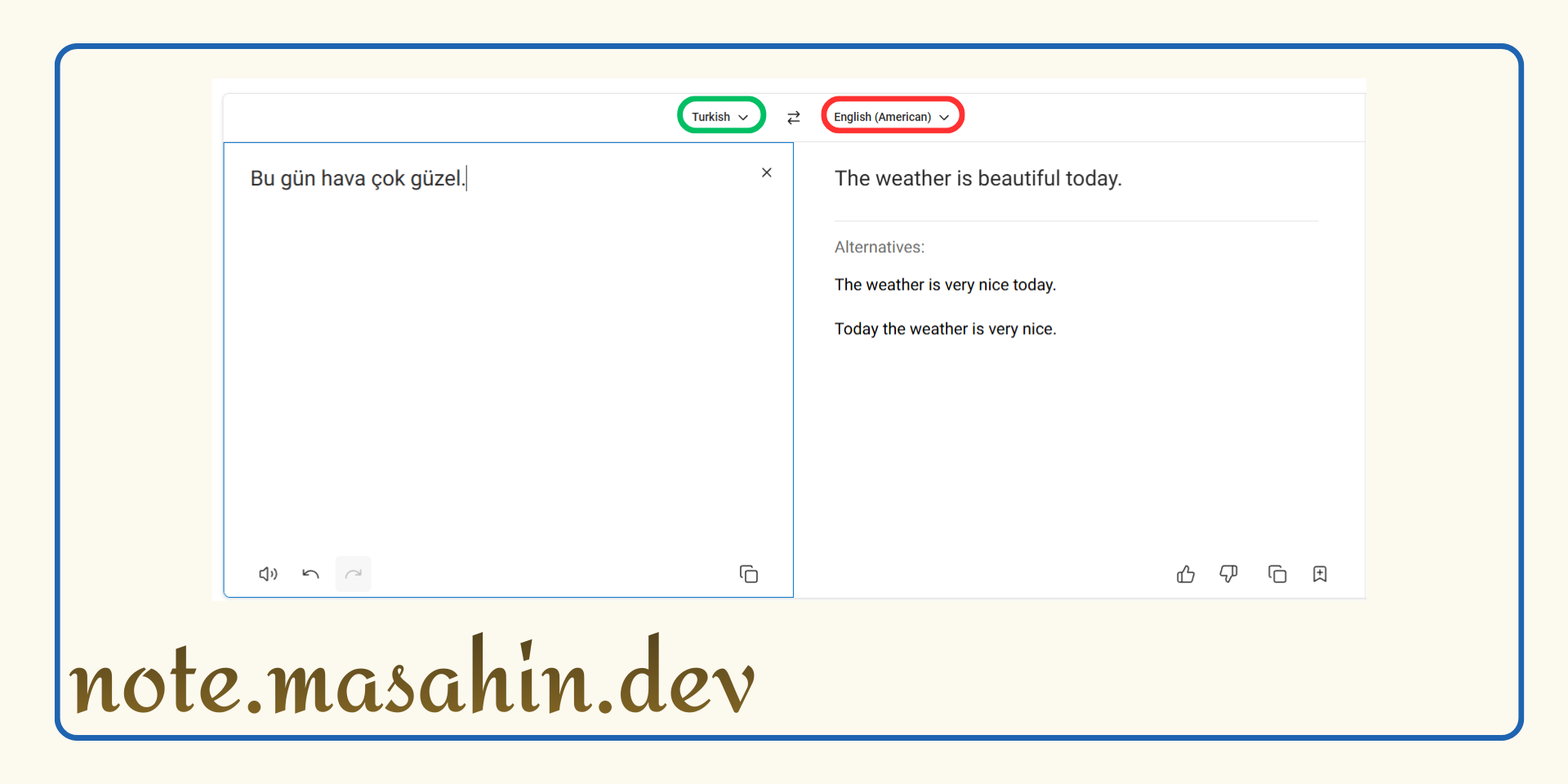 Yeşil alan içerisinden giriş dili seçilir ve kırmızı alan içinden ise çıkış dili seçilir. Bu şekilde basit bir çeviri gerçekleştirilebilir.
